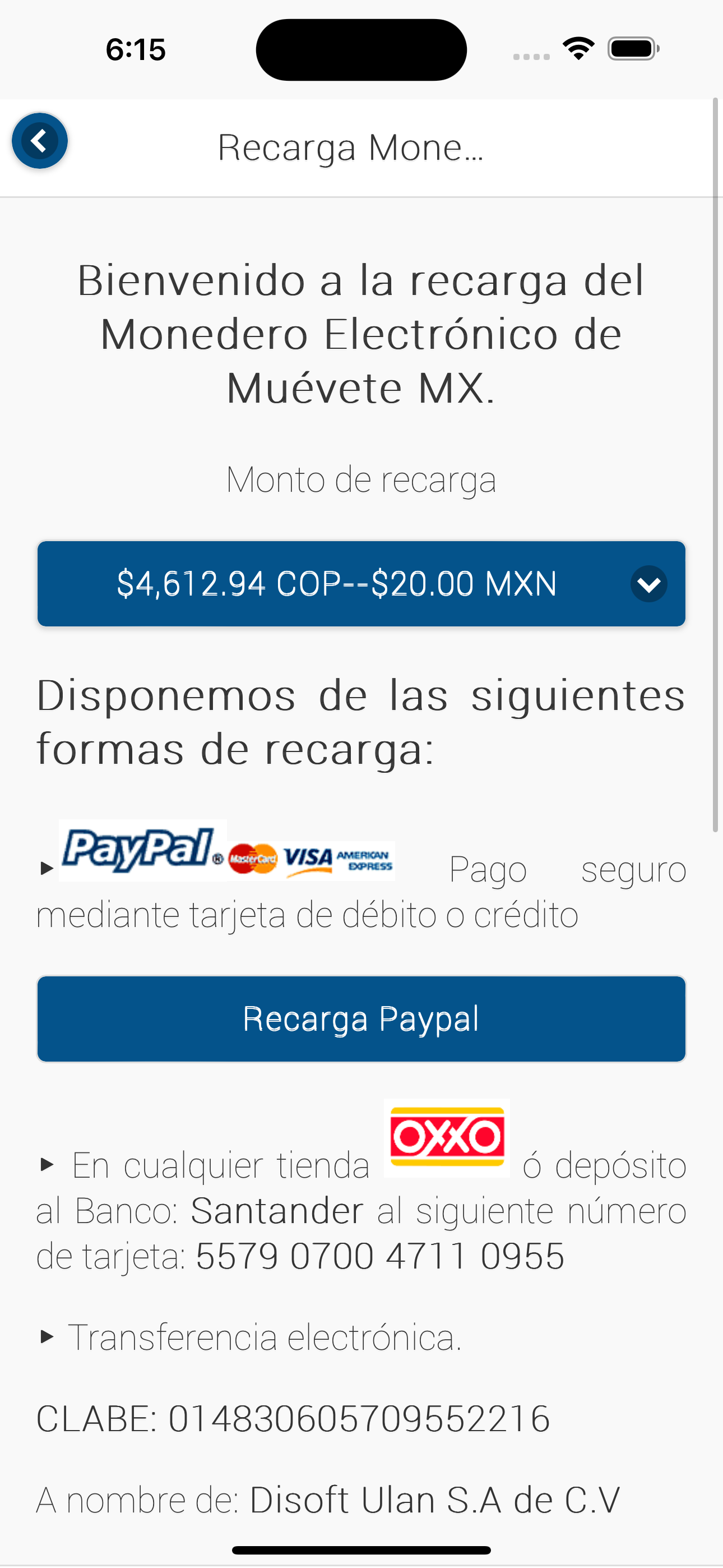 Al pulsar el botón Recargar aparecerán los montos de recarga desde $20.00 MXN a $1,000.00 pesos MXN, según sea el caso de la moneda configurada. Las formas de pago son en Paypal para pago seguro con tarjeta de crédito o débito Visa, Master Card, American y en cualquier tienda Oxxo, depósito a banco ó bien por transferencia electrónica descrita en las instrucciones. En la opción por pago electrónico Paypal el sistema realiza en automático el abono a su saldo. Para la opción de depósito o transferencia deberá seguir las instrucciones descritas.
