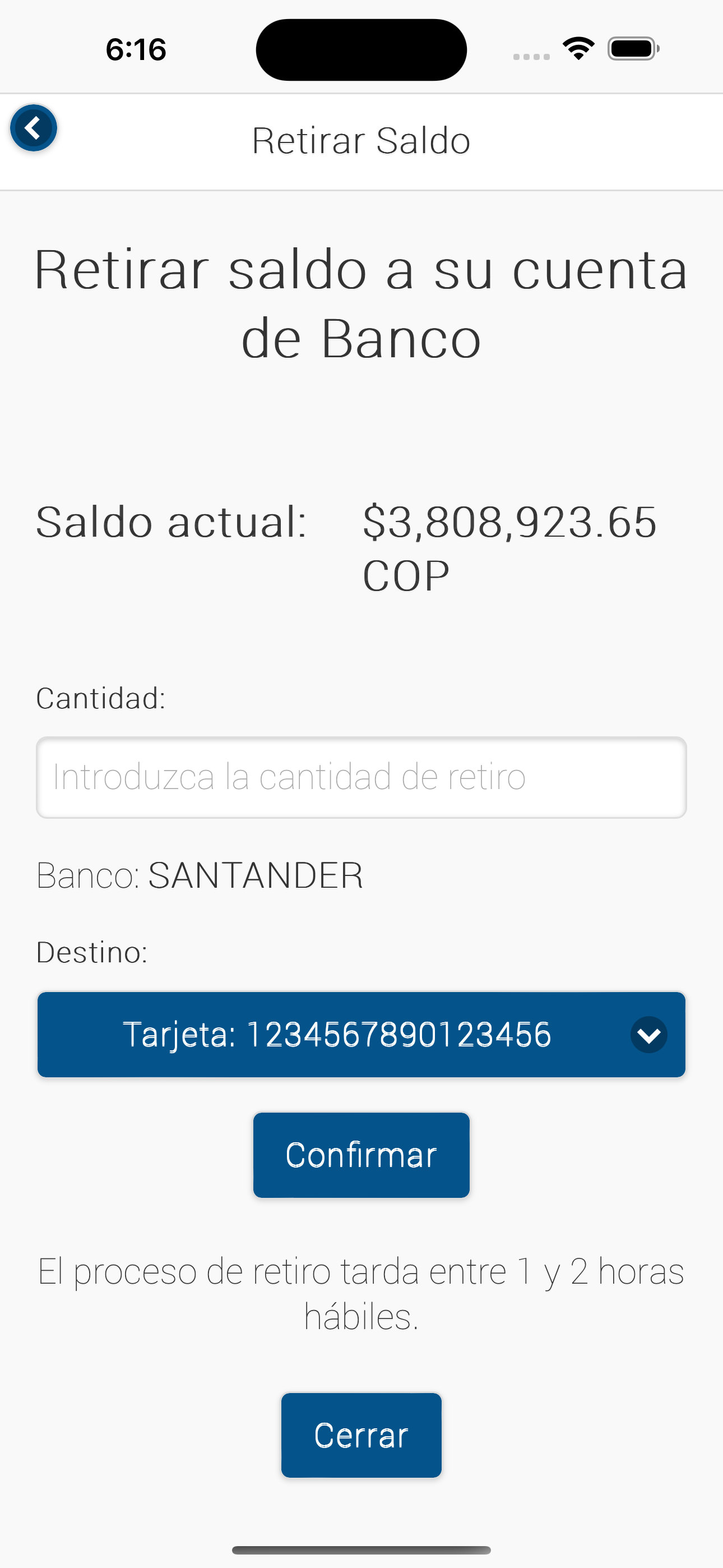 Aquí podemos retirar el saldo deseado a nuestra cuenta de banco ingresando la cantidad y seleccionando la Tarjeta o número de Clabe destino registrados en Mis datos. Posteriormente pulsar Confirmar, el sistema indicará que se ha llevado la solicitud con éxito, deberá esperar el tiempo establecido para que se vea reflejado en su cuenta de banco.