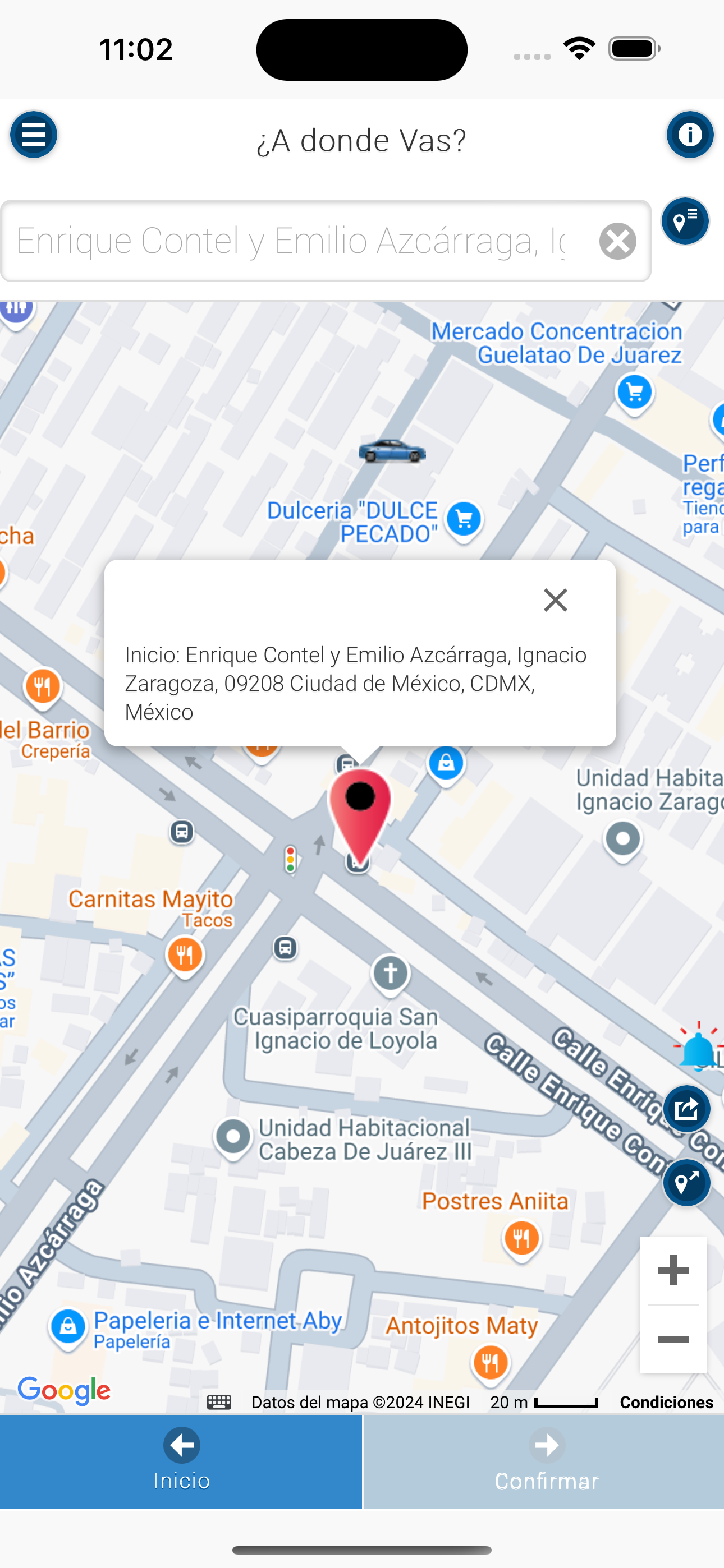 Nos pedirá a donde vamos, en la parte del recuadro de arriba podemos escribir el lugar o dirección deseada ó bien pulsamos en el mapa el lugar. Si el viaje es de alguna persona que esté en otra ubicación le podemos indicar que llegue a nuestra ubicación con el botón Mi ubicación. Posteriormente pulsar el botón Confirmar