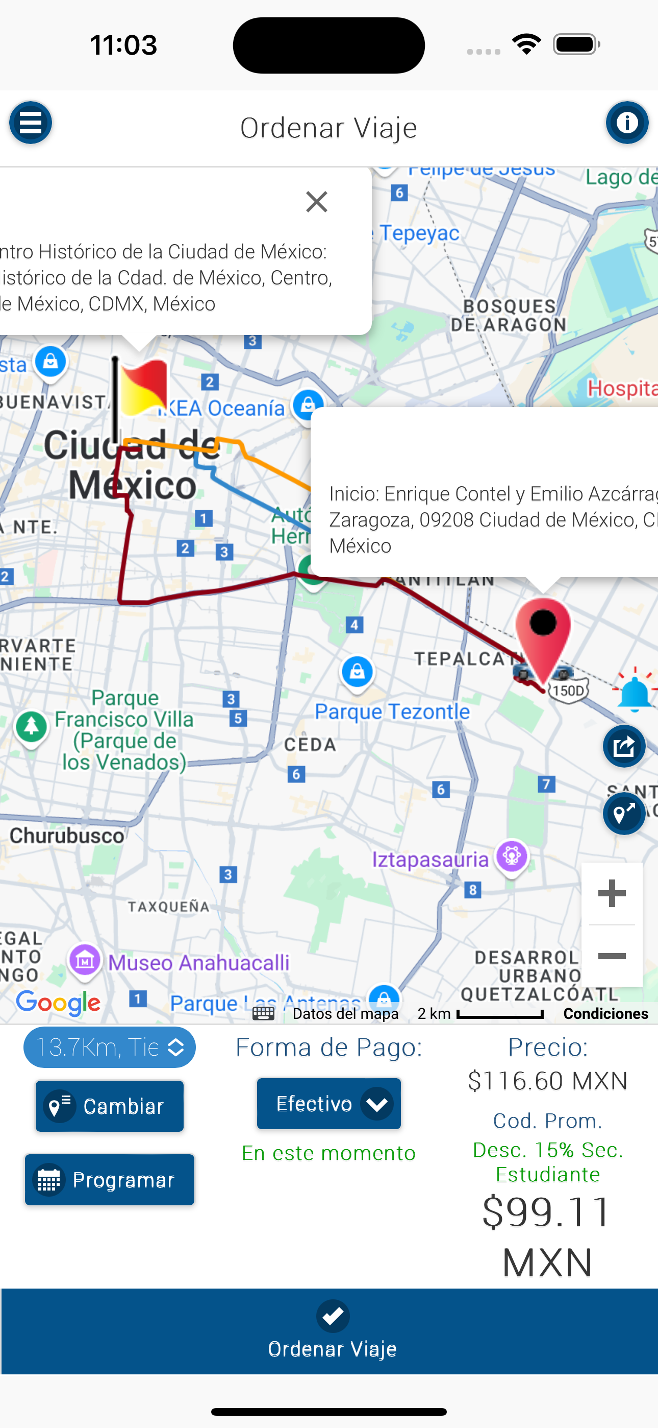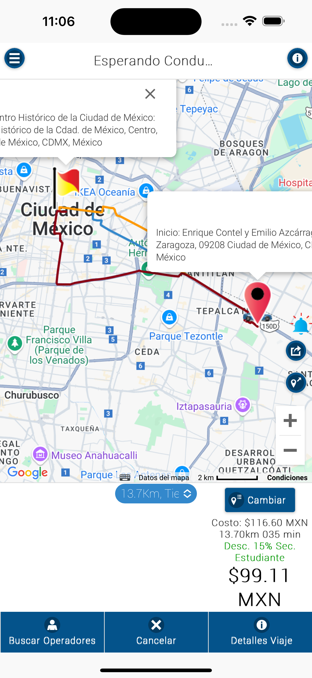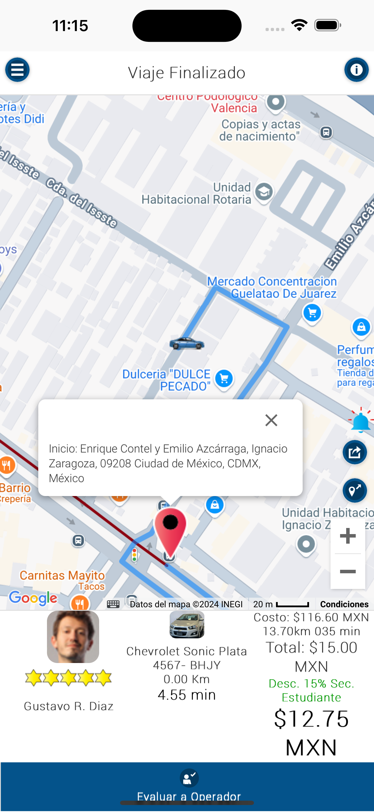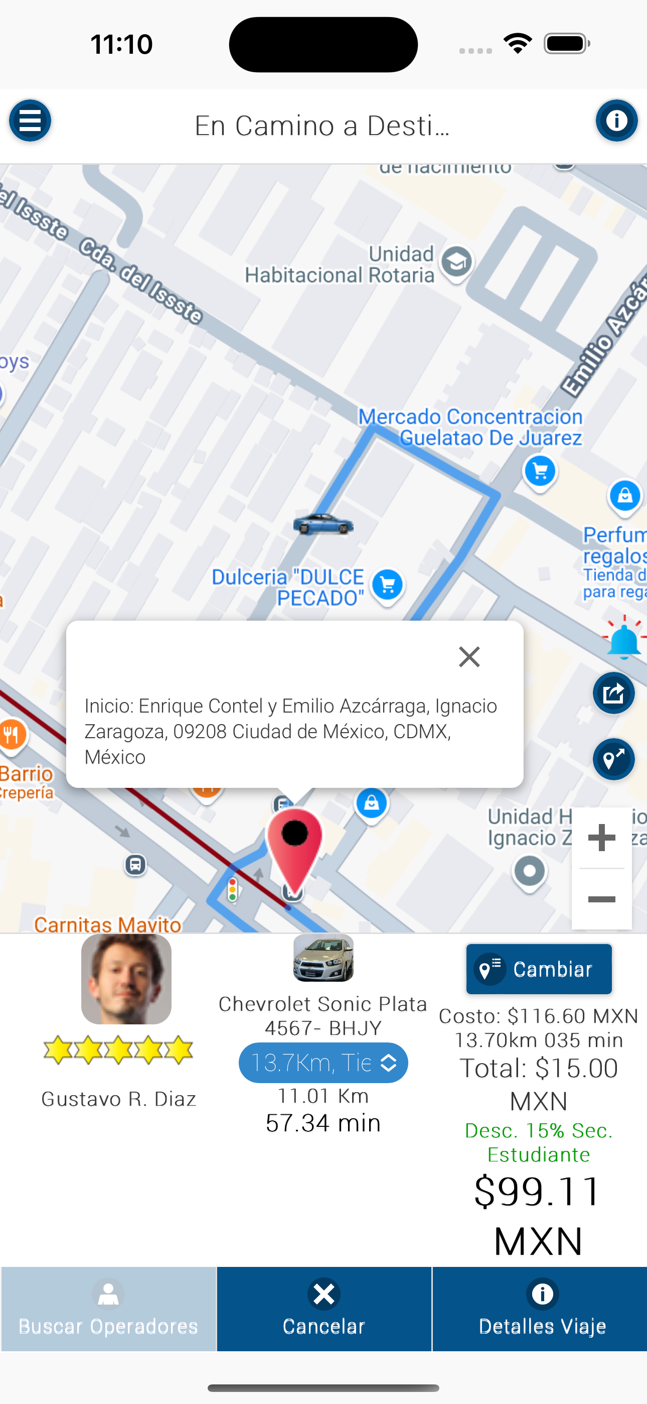 Posteriormente en cuanto el conductor inicie el viaje aparecerá en la pantalla "En Camino a Destino". Una vez finalizado, "Viaje Finalizado" como se muestra a continuación: