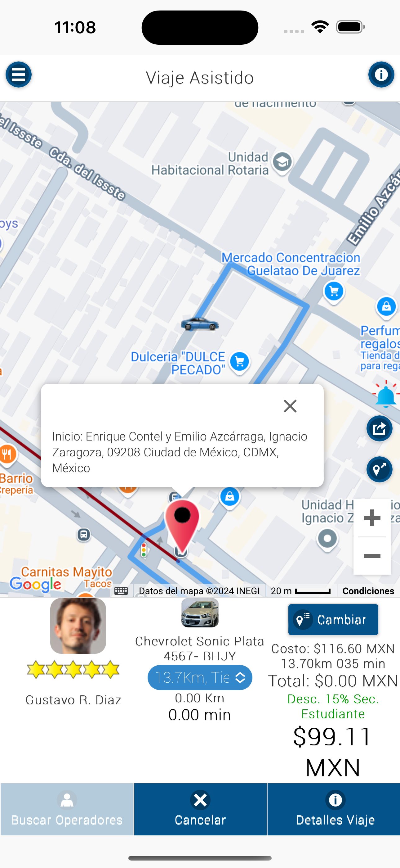 Cuando el conductor acepte la solicitud aparecerá la siguiente pantalla que indica que el viaje esta asistido: