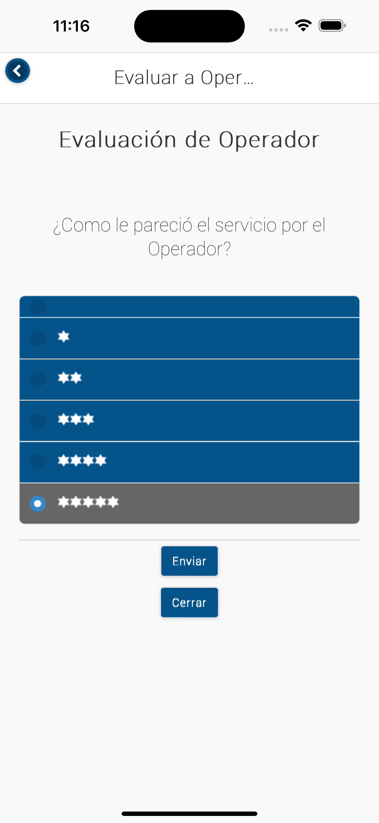 Por último el pasajero puede evaluar al Operador pulsando el botón Evaluar a Operador ó bien seleccionando en el Menú principal de la App: Viajes-->Historial de Viajes-->Historial. Pulsar el viaje deseado y después el botón Evaluar a Operador, aparecerá la siguiente imagen: