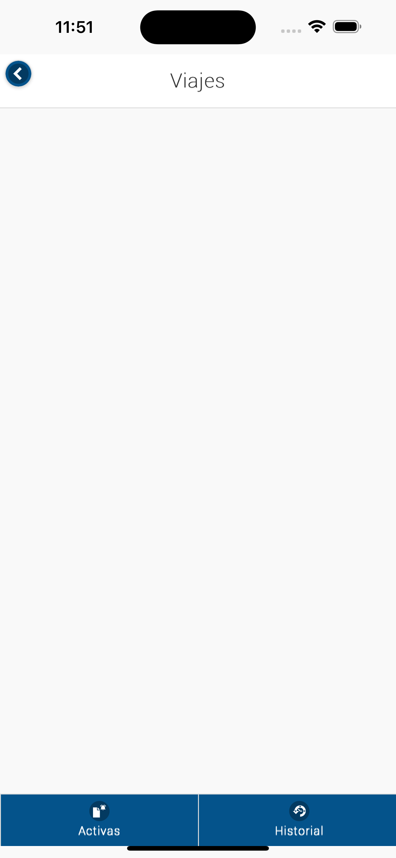 En esta pantalla se verán los viajes que puedan estar activos, ó ver el historial pulsando el botón Historial.