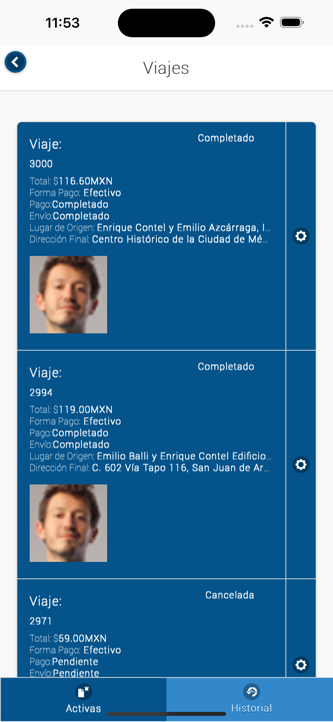 Aquí se pude ver el estado del viaje si fue completado ó cancelado, así mismo los datos principales como costo, origen, destino, forma de pago.